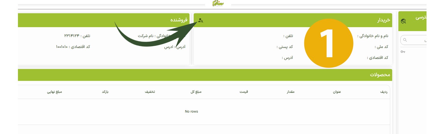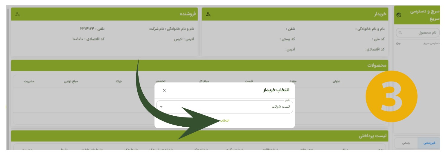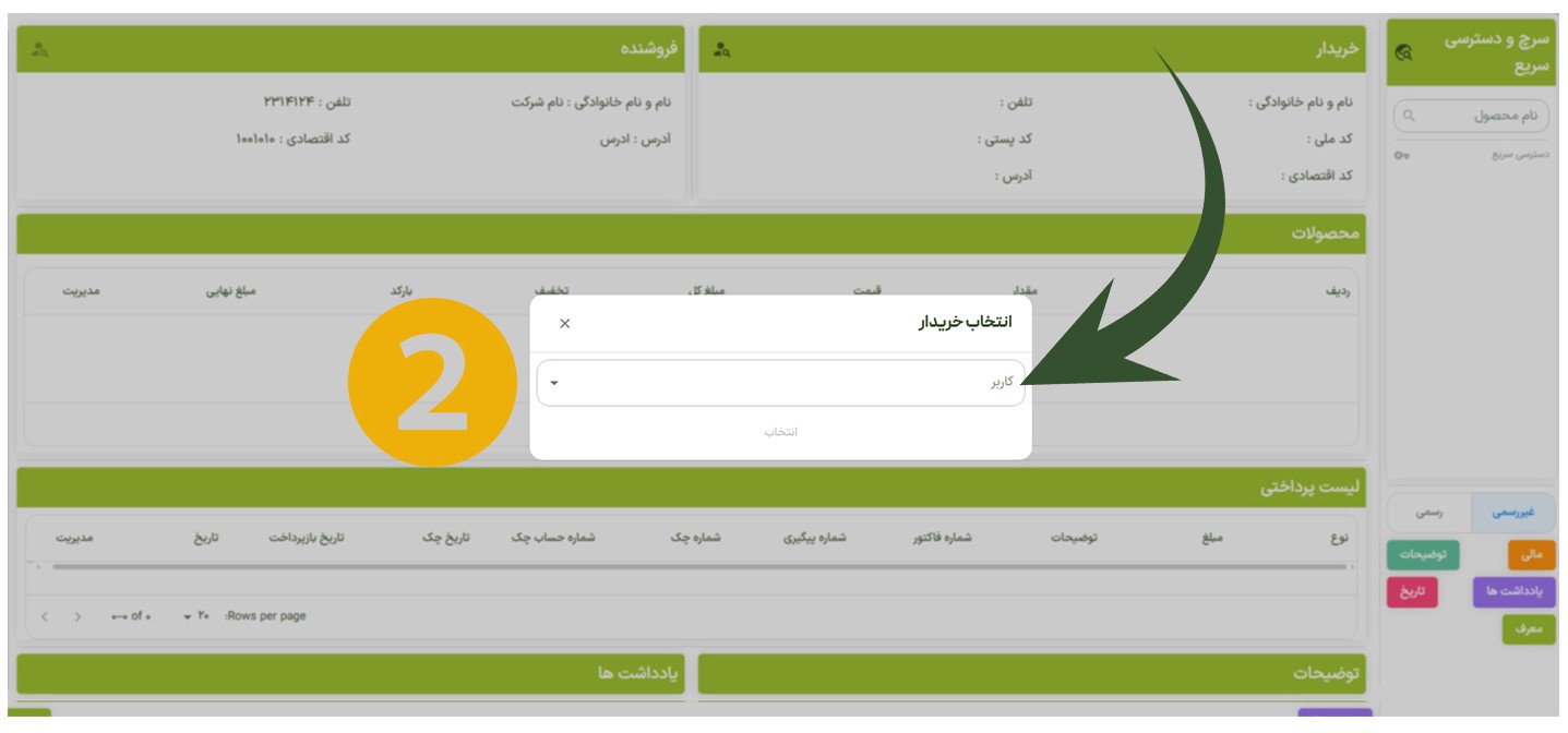 با کلیک روی گزینه انتخاب خریدار، پنل مربوطه بهصورت خودکار باز میشود