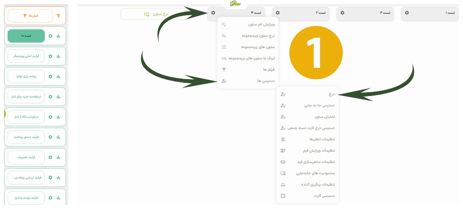 برای دادن دسترسی درج کارت، ابتدا وارد صفحه ستونها میشویم تا لیست کامل ستونهای موجود در سیستم را مشاهده کنیم
