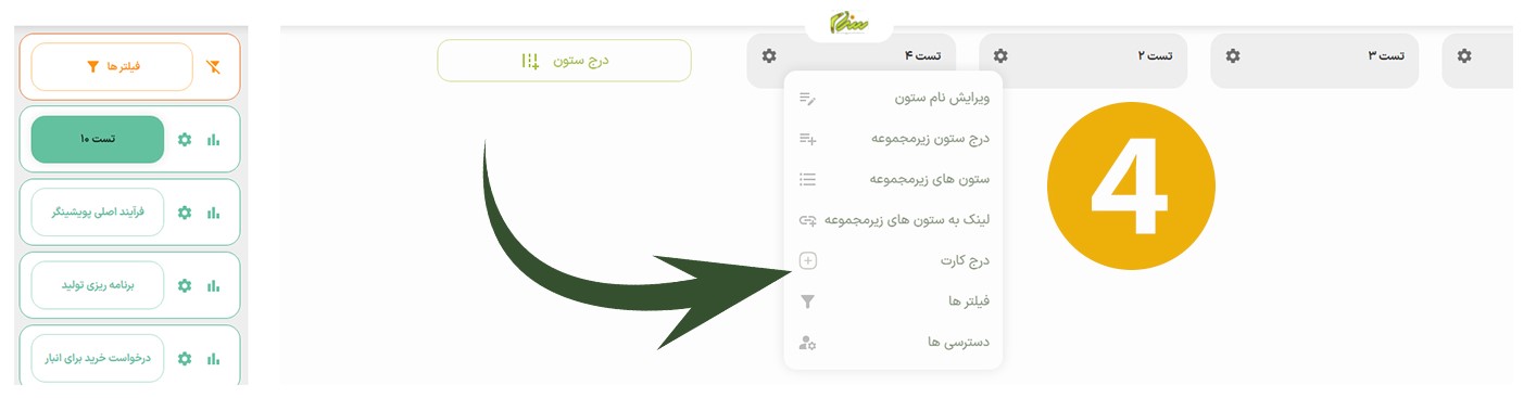 برای درج کارت به روی ستون مورد نظر روی گزینه درج کارت کلیک میکنیم